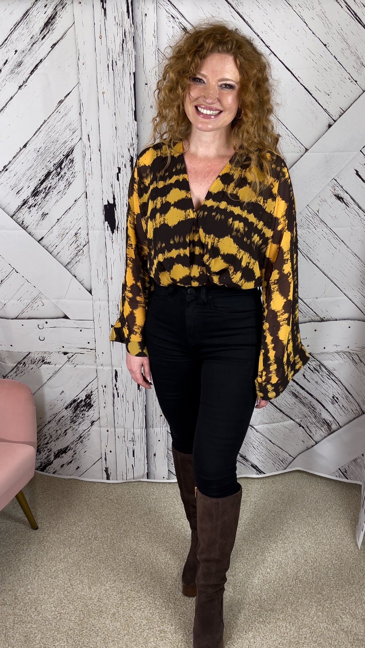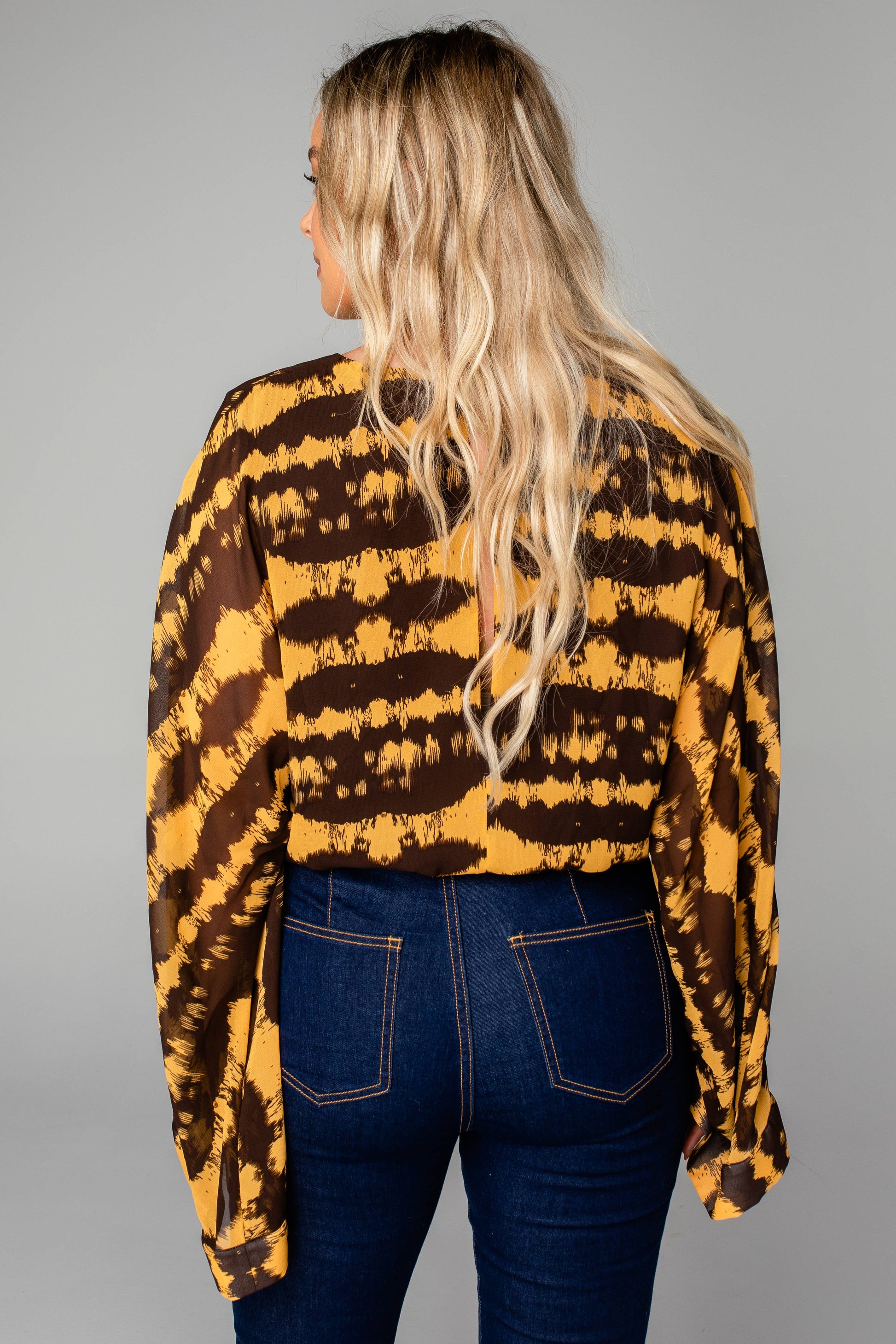 GO OFFFF this season in our new Ariana Bodysuit! She features a surplice neckline, button closure, long kimono sleeves and button closure on the bottom! She is paired perfectly with moonshine jeans and booties!