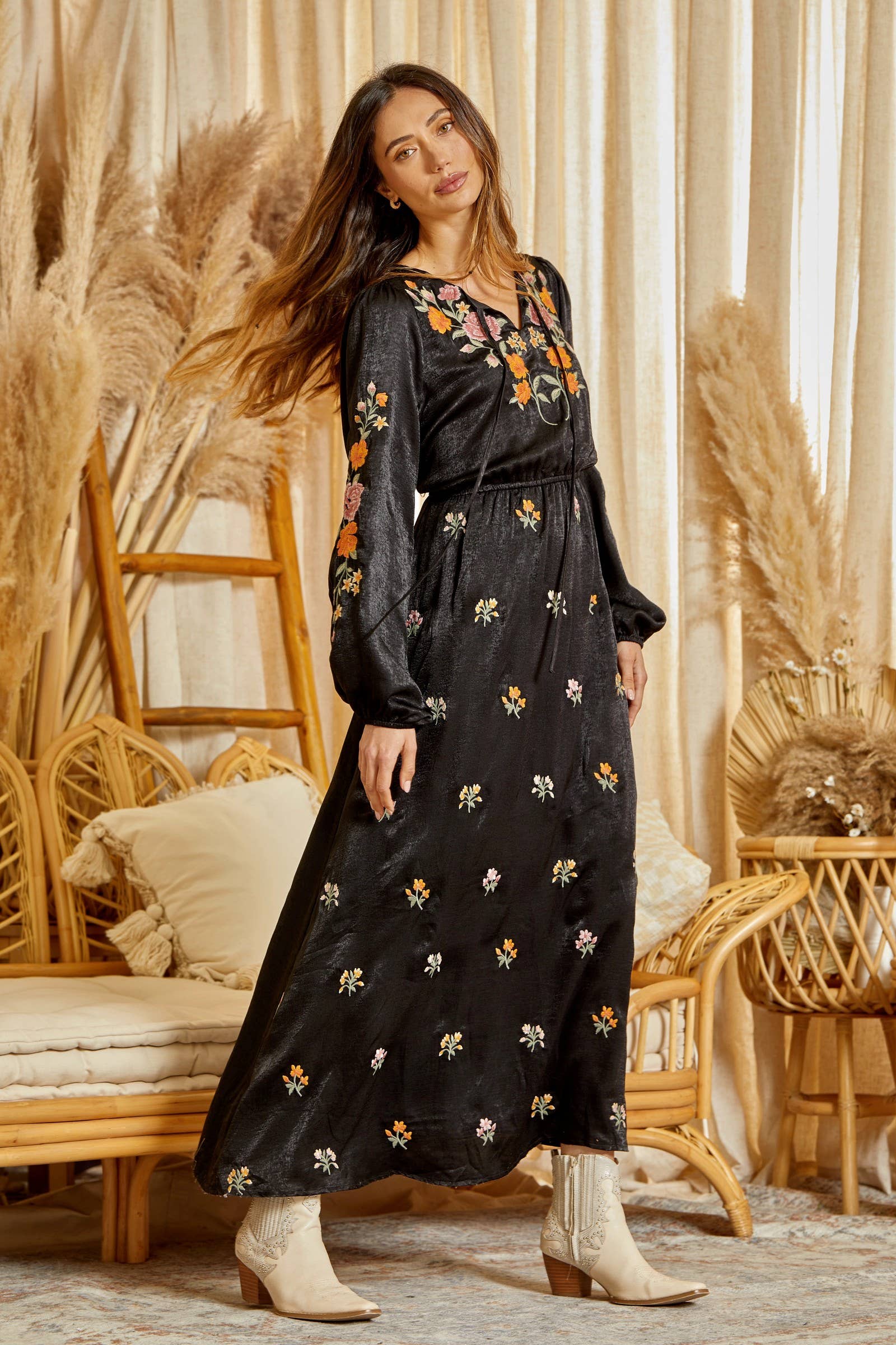 This floral embroidery maxi dress features elastic on the waistline with long sleeves. Tassel detailing with easy bodice. Non sheer, woven. Brand: Savanna Jane.